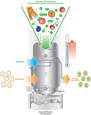 sekundären Pflanzenstoffen, Vitaminen, Mineralstoffen und Spurenelementen gezüchtet. Dieses Verfahren ist einzigartig, denn es sorgt dafür, dass die Enzym-Hefezellen biologisch aktiv
