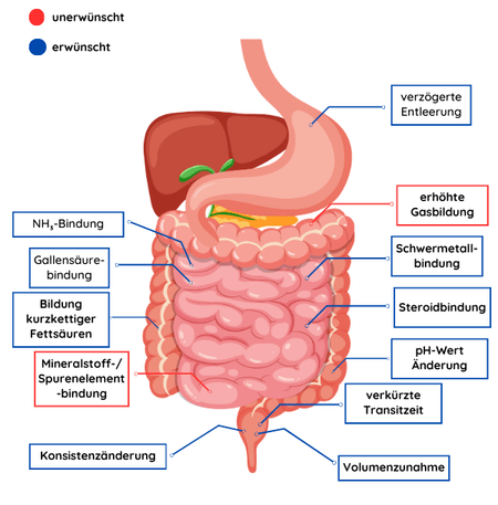 Der Körper profitiert von beiden Ballaststoffarten, da sie jeweils positive Auswirkungen auf den Körper haben. Lösliche Ballaststoffe sind eine Nahrungsquelle für Darmmikroben, die kurzkettige Fettsäuren produzieren, die wiederum den Darmzellen Energie liefern. Unlösliche Ballaststoffe beschleunigen die Darmpassage, lockern den Stuhlgang und wirken wie ein natürlicher Reiniger für den Darm. Eine ausreichende Ballaststoffzufuhr ist daher wichtig, jedoch sollte darauf geachtet werden, ausreichend Flüssigkeit zu trinken, um Verstopfungen zu vermeiden. 1,2,4